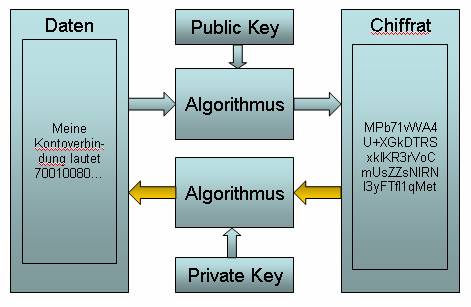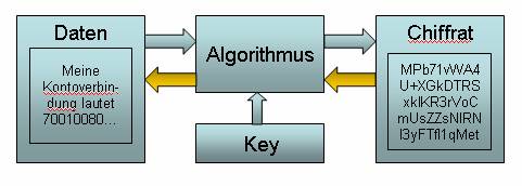 Natürlich geht das ganze auch umgekehrt beim Entschlüsseln (gelbe Pfeile). Dieses Verfahren nennt man symmetrisch.