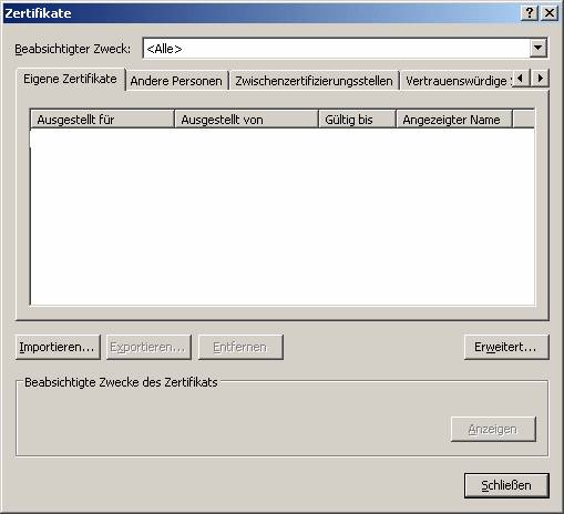 Wie man sieht, ist Eigene Zertifikate noch leer.