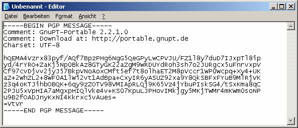 Mittels Rechtsklick auf WinPT-Icon > aktuelles Fenster > Verschlüsseln können Sie den Text schon mal mit ihrem eigenen public key verschlüsseln. Das Ergebnis könnte so aussehen.